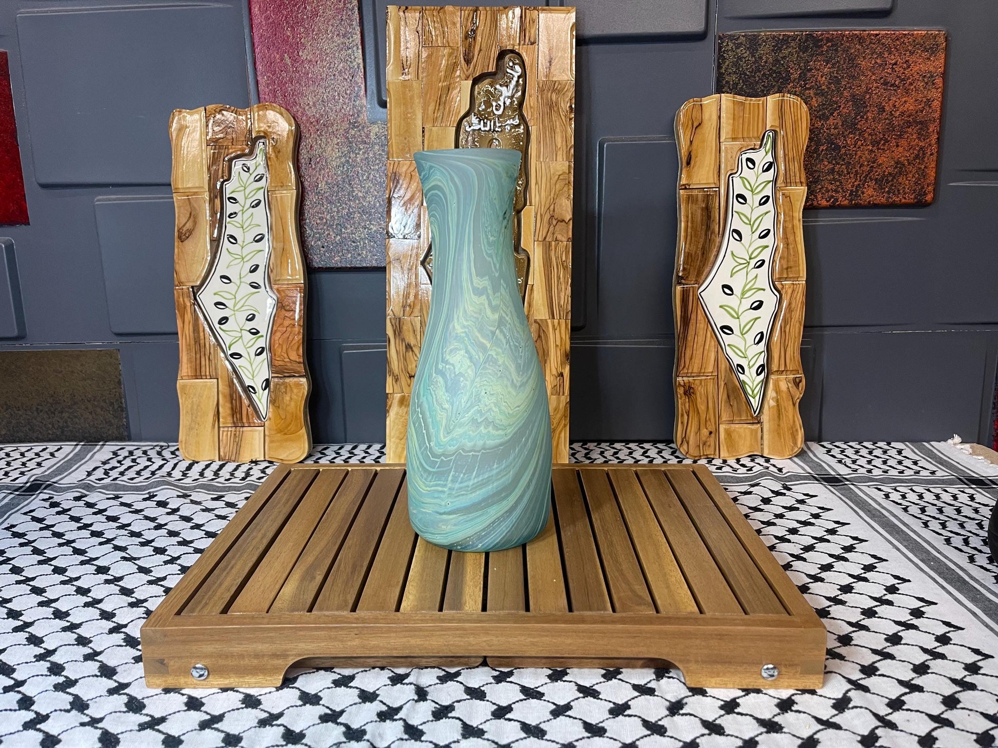 11x4.5 inch Teal Blue marble designElevate your space with this one-of-a-kind hand-blown glass jug vase, crafted in the heart of Hebron, Palestine—home to a centuries-old glassmaking tradition that traces its roots back to the Phoenicians. This stunning blue marble design is a testament to the artistry of Palestinian glassblowers, each piece showcasing a unique, unrepeatable pattern, making it truly one of a kind.Inspired by Venetian glassmaking techniques, Hebron artisans have perfected the delicate balance between tradition and innovation, infusing every piece with the legacy of their ancestors. This exquisite decorative vase can be used as a statement piece, a flower vase, or a collector’s item that embodies both history and artistry.Features: - Hand-blown by Palestinian artisans in Hebron - Rich blue marble pattern – no two pieces are the same. - Inspired by ancient Phoenician and Venetian glass techniques - Perfect for home décor, gifting, or collectors of authentic Palestinian art - Ethically made, supporting local Palestinian craftsmanshipBring home a piece of history and support the timeless artistry of Palestinian glassmakers. Order now and own a true work of art!