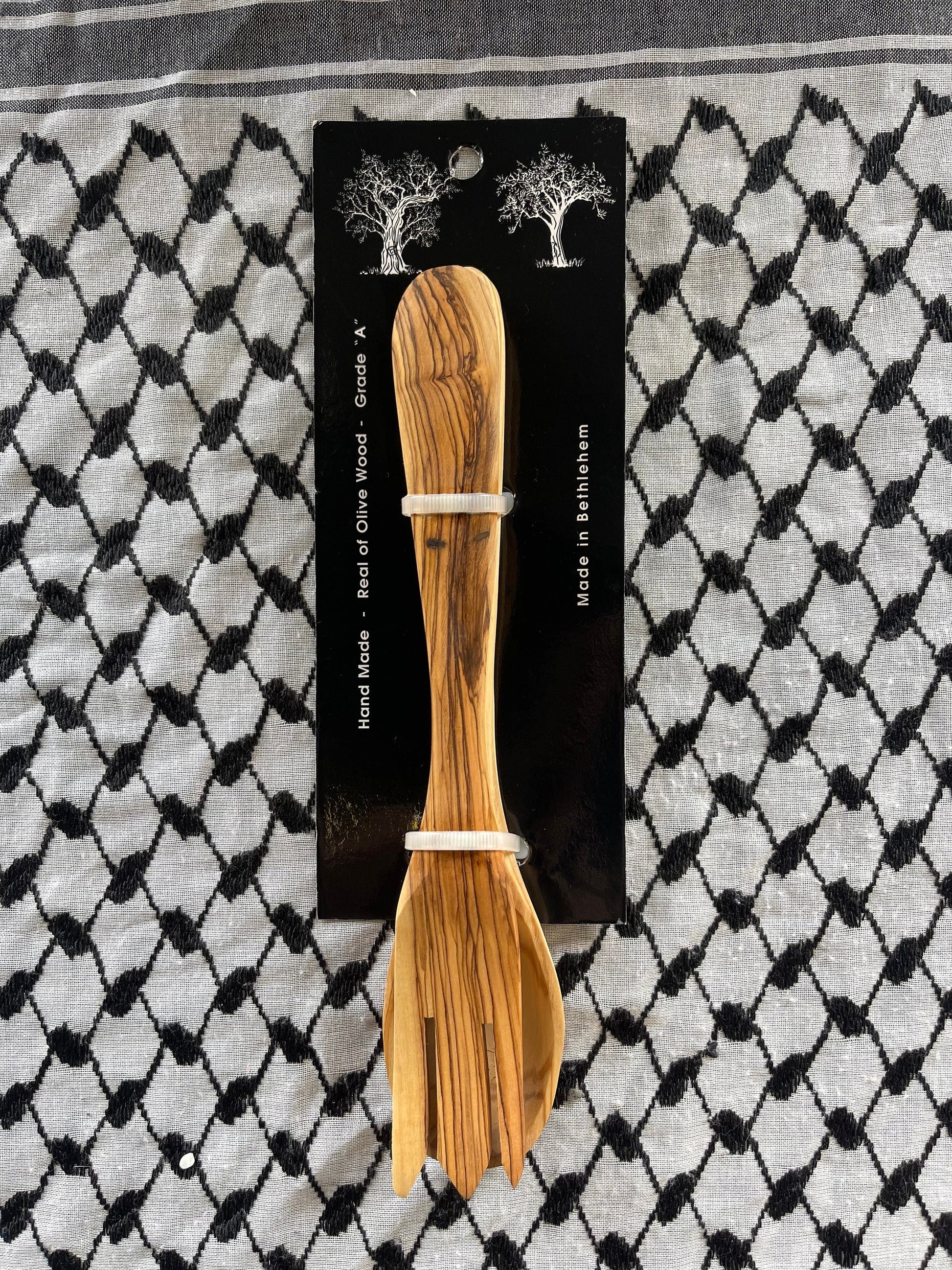 Hand Made Olivewood Cooking Spoon and fork Hand Crafted in Bethlehem Made in Palestinelength: 12 InchWe certify that this product is olivewood handmade obtained from old olive tree pruned from the hills of the Holy Land especially